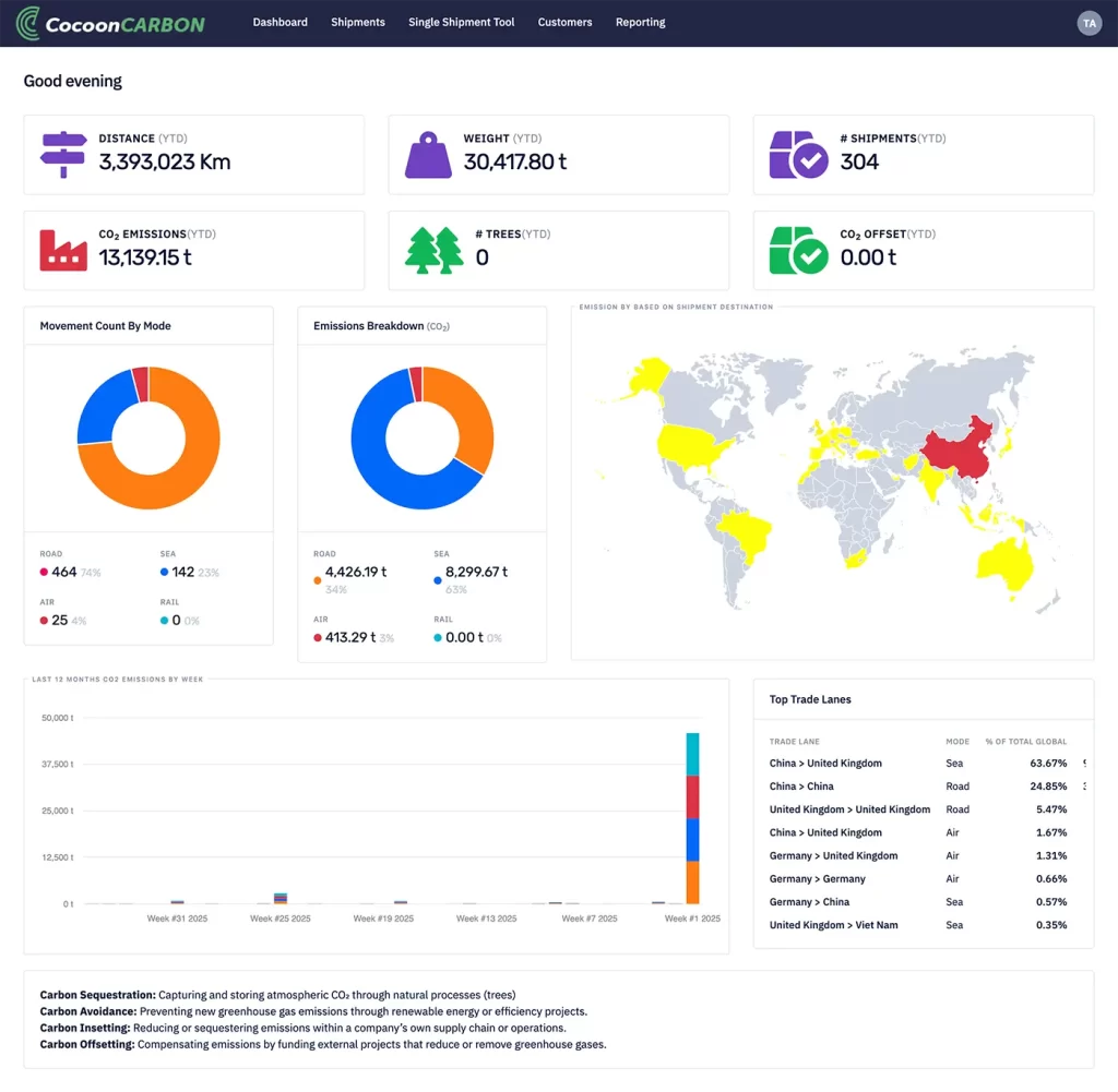 All your logistics emissions Air/Sea/Road/Rail, one powerful platform. That’s CocoonCarbon®